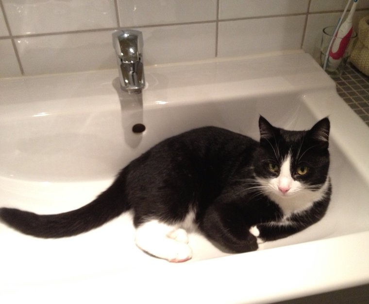 Svart og kvit hokatt. Litt kvitt på alle potar, samt litt kvit på haletuppen.