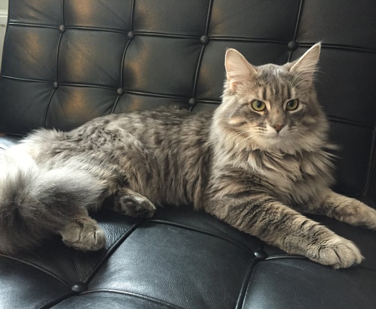 Ser ut som Maine Coon, men avstamming er usikker. Tykk, bustete hale. Har også litt flekker i pelsen med caffe latte-farge i tillegg til det grå og hvite. Makrell-aktig mønster på kroppen.