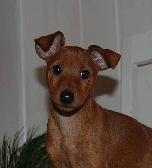 liten og brun dvergpinsher med svart halsbånd med diamanter hadde også et refleksbånd rundt halsen.