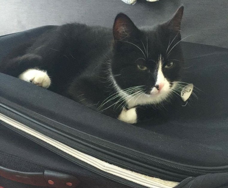 V formet hvit på nesen og ned halsen. Hvite poter. Redd og skeptisk ute, men når han kommer inn og er trygg er han veldig snill og kosete.