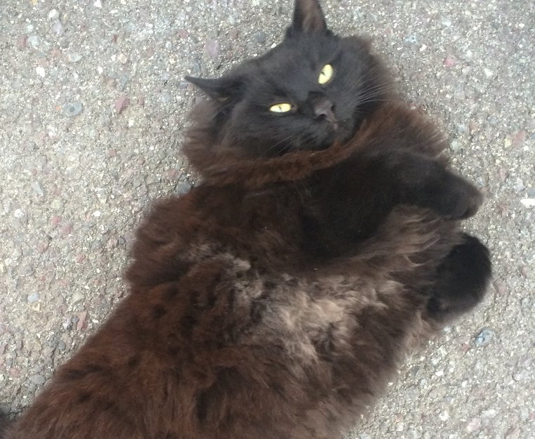 Han er rundt 5kg, helsort, men i sola/lyset ser han brunaktig ut. Under på magen er pelsen no lysere, men alt i alt er svart langhåret katt. Chippet!
