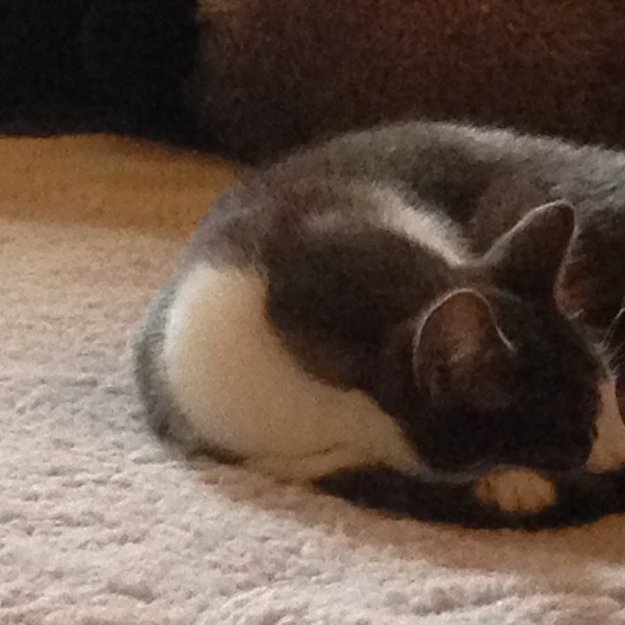 Tofarget grå og hvit, med en ekstra flekk på leppa og brungrå hake.