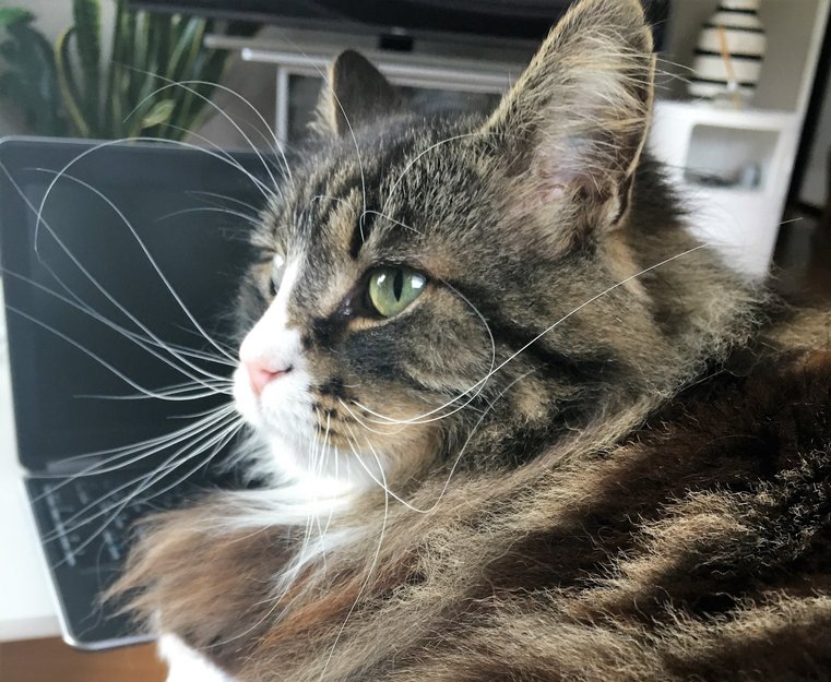 Hvit maske, mage og sokker. Litt sort på leppa. Liker best kos på hodet og ikke kroppen. Foretrekker, oftest, tørrfôr fremfor våtfôr.