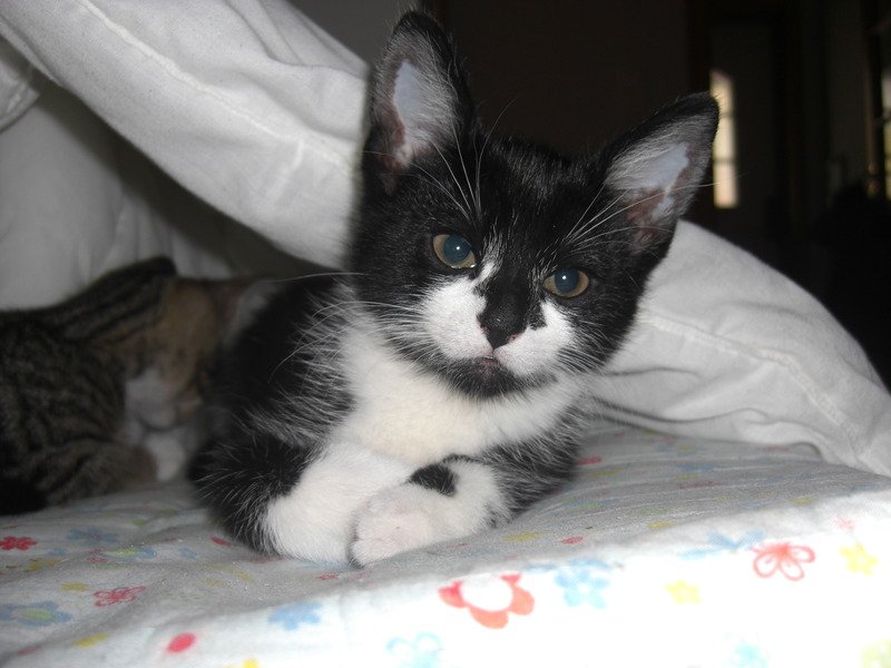 Katten er liten og svart, med noen hvite flekker på.
