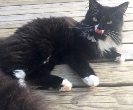 Hvite sokker på alle 4 beina. Langhåret og staselig hale. Semilanghåret pelslag.