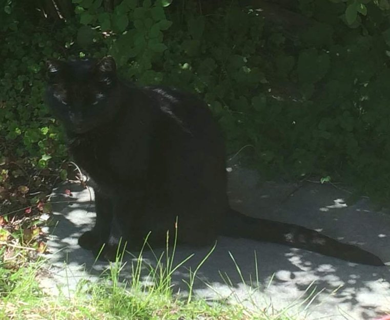 Gammel men sprek. Glatt pels, kan være sosial og kjælen. To tre hvite hår på brystet, ellers helt svart. Godt synlig hakk i øret, leselig øre-tatoo. Er chippet.
