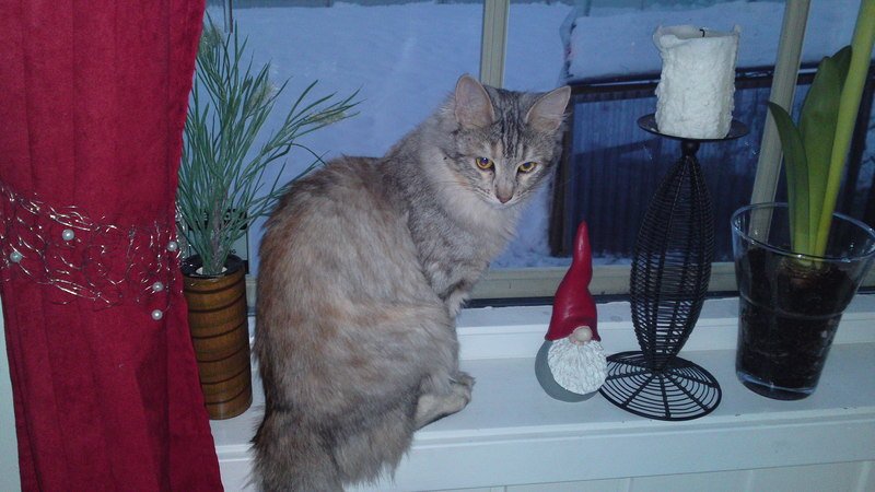 Hun er veldig sosial og snakker/mjauer mye. Hun er en inne katt og har aldri vært ute lenger enn 15min i gangen, og da i bånd.