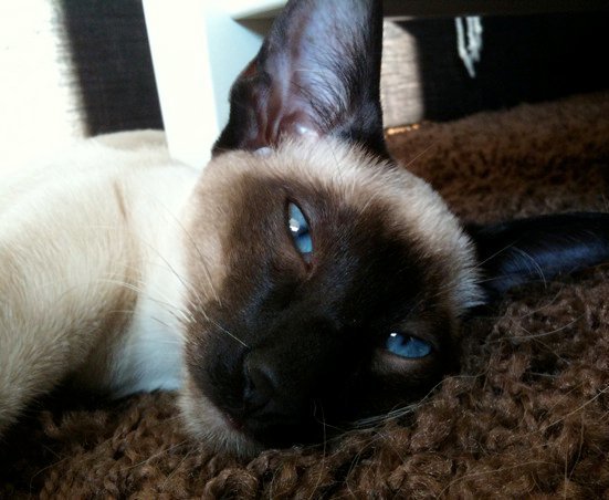 Vanlig siameserfarger. Brun i ansiktet, på halen føttene og kremet hvit ellers på kroppen. Øynene er blå.