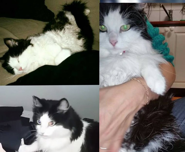 Beskrivelse: Øynene hennes er mørke-grønne,ryggen hennes er svart Hvitt i mesteparten av ansikt, hals, mage. og labbene . Hun har også på en refleks halsbånd der det er skrevet telefonnummeret vårt og etternavn Mortensen. DUSØR til den som kan bidra til at hunn komme hjem igjen.