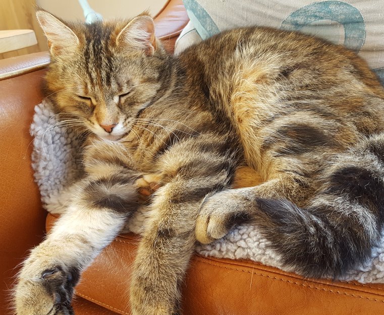 Hassel ble funnet innelåst i offentlig bygg i nærområdet. Hyggelig vaktmann kom og låste en heller desperat katt ut. Nå lykkelig sovende på benken etter mye kos og litt mat.