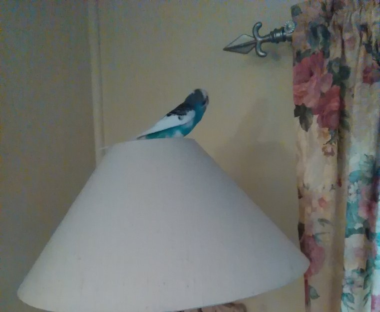 Denne er lyseblå i brystet, hvit hale, hvit flekk på hodet, mørkblå på hver side av nebbet. Tror det er en hunn da delen på nebbet er brunt.