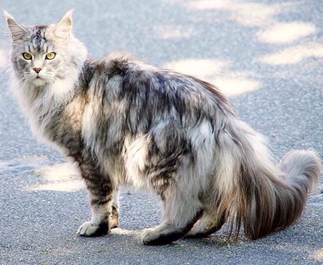 Grå/hvit med sorte såler under potene. Lang buskete hale. Dusker på ørene. Ganske stor.