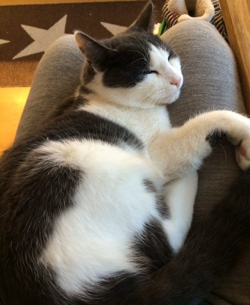 Veldig sosial og kosete, gule øyne. Hvit på magen, bryst, grå på ryggen + grå hale.