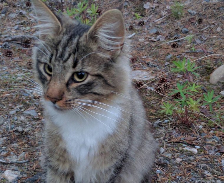 Den dukket opp på gårdsplassen rundt den 27/7-16, gikk og mjauet og skreik rundt huset både natt og dag. Den var på vinduet og klorte, ville inn. Katten er veldig tynn, ringte derfor Dyrebeskyttelsen i Hedmark. Fikk beskjed om å mate den. Den holder fortsatt til her hos oss.
