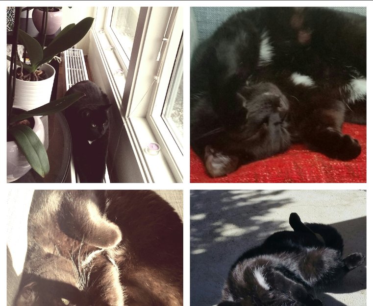 Sort katt med hvite flekker på hals og mage. Hunnkatt. Chippet med merke i øret. Har ikke halsbånd. Pratsom og kosete, men kan være var på lyder. Ca fem år gammel.