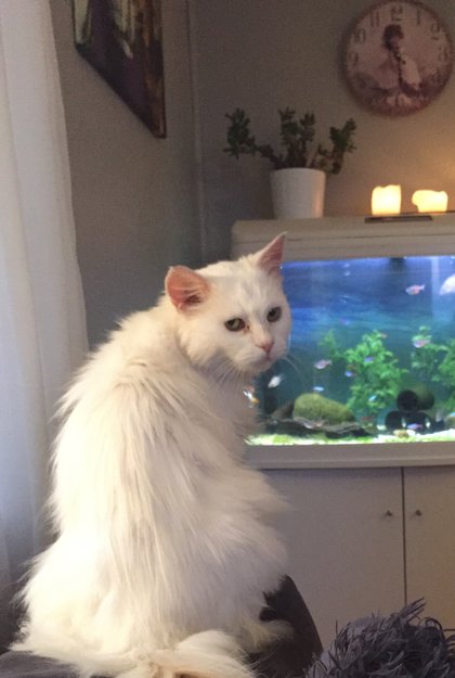 Fant henne på tur, forkommen, sulten, sliten, mange flått og floker! Langhåret, hvit! Vert hos veterinær, er sterilisert men ikke chip! Antar at noen har dumpet henne et sted på Sotra, og at hun har gått ute lenge! (Ettersom ingen på Sotra drar kjensel på henne etter mange delinger på Facebook)