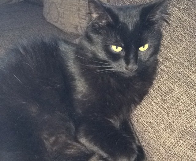 Hannkatt, ca. 5,5 kg. Brun svart, har noen grå hår på halen.