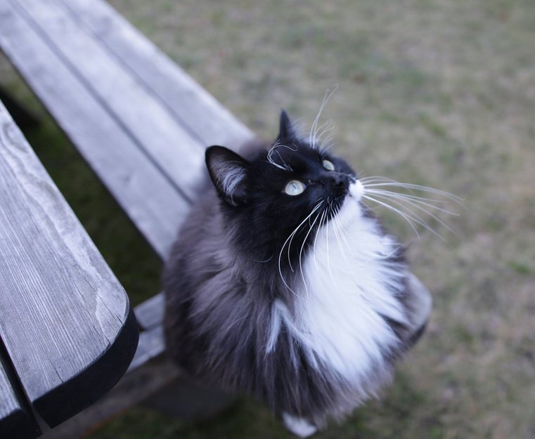Bobbo er langhåret og tofarget; svart med hvitt bryst og hvite ben/ poter.