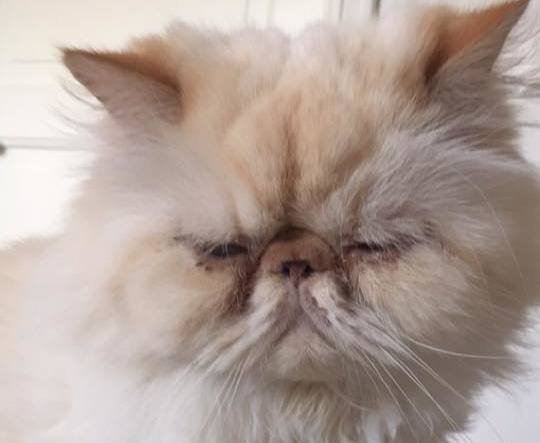 Lang hvit pels med rød snute, øre og litt på halen. Flat nese og rennende øyne. Han er veldig sky og lyder navnet sitt kun fra eier. Han er chippet og kastrert. 9 år. Han er ikke vandt med å være ute. Innekatt.
