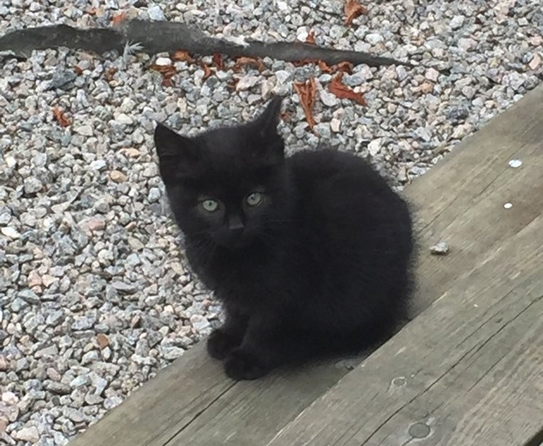 En liten svart kattunge, kanskje 5-6 uker. Kom fra ferie igår og har gått rundt huset her siden, tydelig redd og sulten.