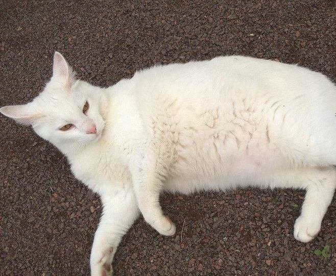 Hvit hunnkatt har oppholdt seg i hagen siden fredag. Den vil veldig gjerne inn. Ser ellers frisk ut.