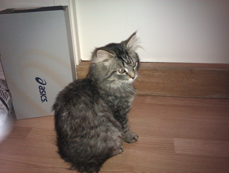 Han er ganske tynn, det ser ut som han har vært ute en stund. Han har lyst, langt hår i ørene og han er lys rundt øyene.