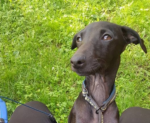 Svart Italian Greyhound, noen hvite markeringer på brystet. Halsbånd i grønt, blått og svart