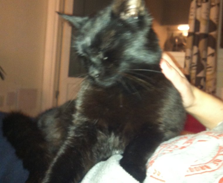 Katten er svart. Bærer preg av å ha vært ute en stund.