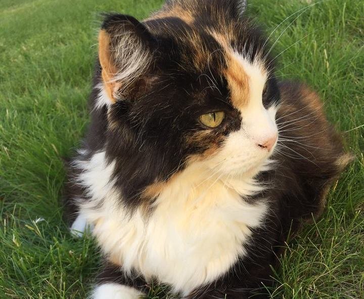 Hun er en tricolorkatt, med fargene hvit / sort / brun ( "orange" ).