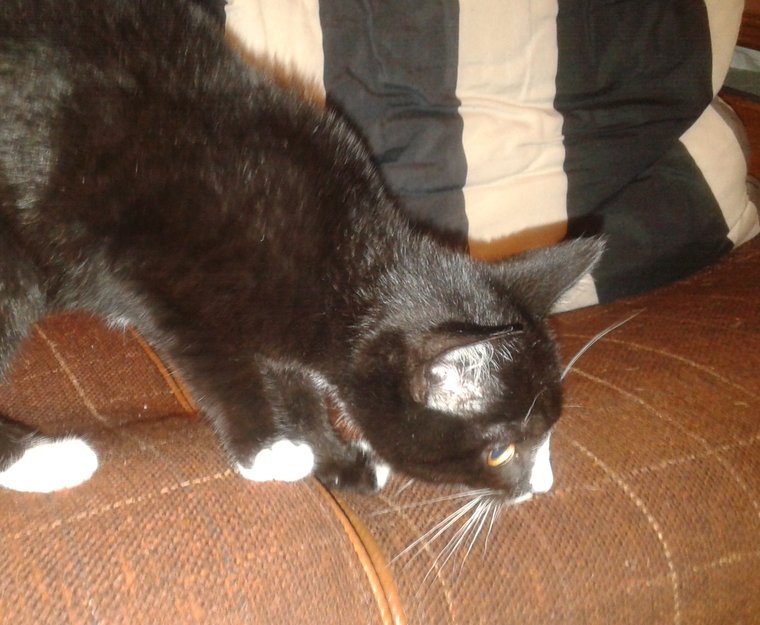 Litt hvit på nese og hals, alle poter er hvite. Ellers er katten helt svart