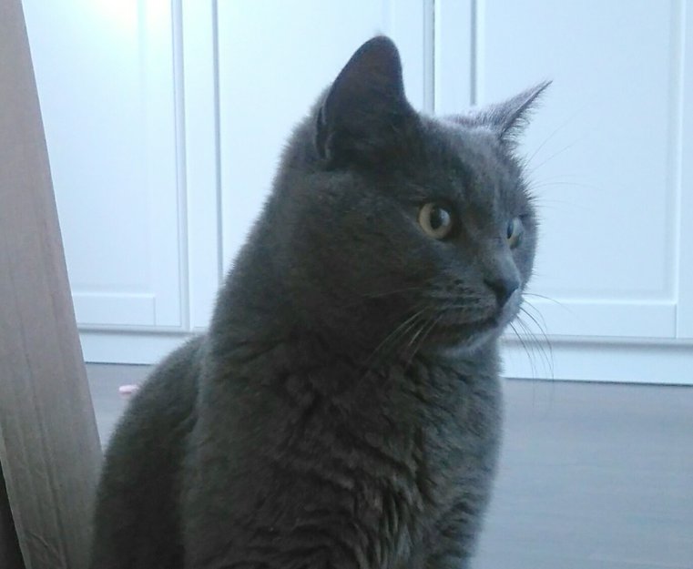 Helgrå, ikke chippa, svak øretattovering som ikke er mulig å tyde. Også mulighet for at dette kan være en kastrert hannkatt. Veldig sosial og kosete.