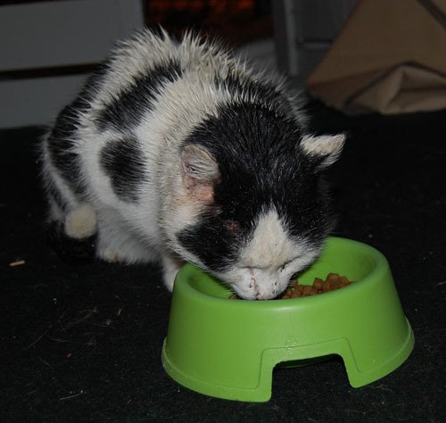 Hannkatt med korthåret hvit og sort pels, sort maske på hodet, hvit haletipp. Masse sår i ansiktet og på ørene, alltid nye sår for hver dag. Har trolig øremidd og ser ut til å ha gått ute lenge. Er svært sulten og tynn, og alltid skitten i pelsen. Ukastrert, driver å skvetter på hushjørner og busker i området og ypper til bråk med de andre kattene i nabolaget hele tiden. Han kommer når vi snakker til han med lys stemme, er en snill og rolig type, men skvetter til ved høye lyder. Har ikke fått kommet så nært at jeg ser noe øremerke, ørene er svært skittne så det er vanskelig å se. Katten går fortsatt ute, hadde det ikke vært for at han jager vår egen pus hadde vi tatt han inn, men blir det veldig kaldt, vil vi forsøke å ta han inn.