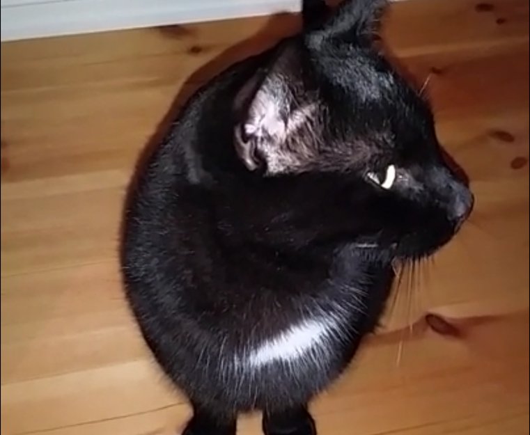 Stor, nesten 7kg, sort katt med hvit flekk under hake og litt under magen. Mange arr og merker etter slåsskamper, spesielt på toppen av hodet og rundt halsen. Mjauer mye.