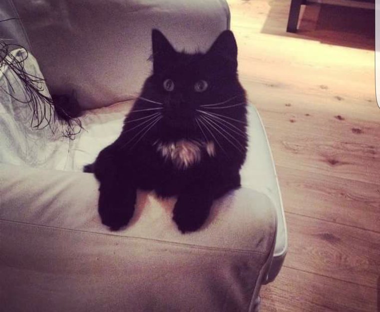 Odin er svart, har to hvite bakpoter og hvit på brystet. Han har også hvite værhår. Lang pels.