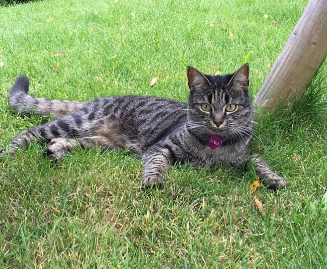 Hun er grå med svarte flekker, svart langs hele ryggraden og hvit under. Hun bærer et rosa halsbånd med navnet sitt på og mitt mobilnummer. Veldig kosete og elsker å lage lyd. Mia er chippet og øremerket.