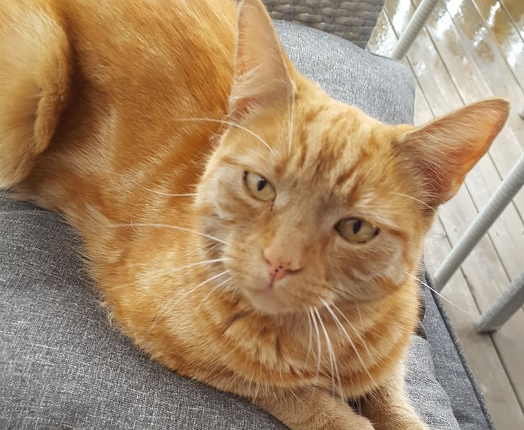 Han har noen svarte prikker på nesen. Halen går som regel rett opp og bøyer opp mot ryggen. Han er litt sky for ukjente mennesker.