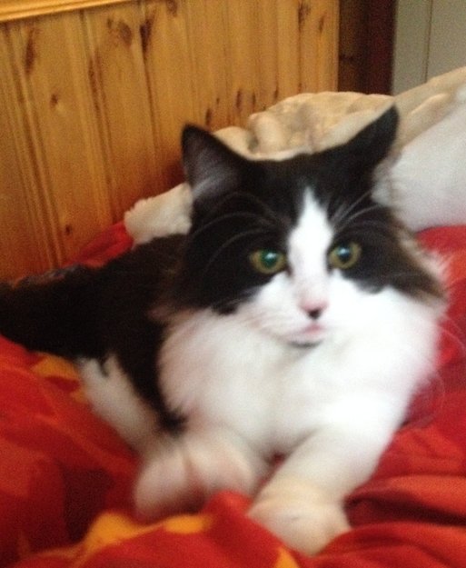 Sofia er en snill, svart og hvit, langhåret katt. Hun har en svart prikk på nesen. Usikker på alderen, men vi antar at hun er ca. 2 år gammel.