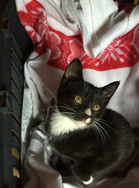 Denne lille kattungen skreik som bare det og stod på trappa til naboen kl.04 i går morges da han kom hjem fra jobb. Den pilte inn i stua da han åpnet døra og var litt forskremt, og veldig sulten. Da han satte fram mat til den så kom den etter hvert fram. Naboen min kom og spurte om vi savnet en kattunge eller visste hvem som eide den. Det gjorde vi ikke. Han hadde lite mulighet til å ta seg av den fordi han jobbet så mye. Så jeg tok på meg ansvaret om å prøve å finne eier til denne lille skjønne kattungen som nok er knapt 2 mnd. Usikker på kjønn, men mulig det kan være en hann. Den blir fort tillitsfull når den føler seg trygg og blir koset med så jeg tror ikke den kunne ha vært så lenge ute. Hvis du savner en kattunge så ta kontakt snarest. Har to katter fra før som ikke godtar den lille, så da må de være adskilt. Den lille trenger å finne eieren sin snarest så den ikke knytter seg for mye til meg.