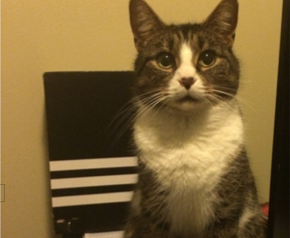 Tigerstripet katt, med hvite poter, hvit "krage" og hvit midt i ansiktet.