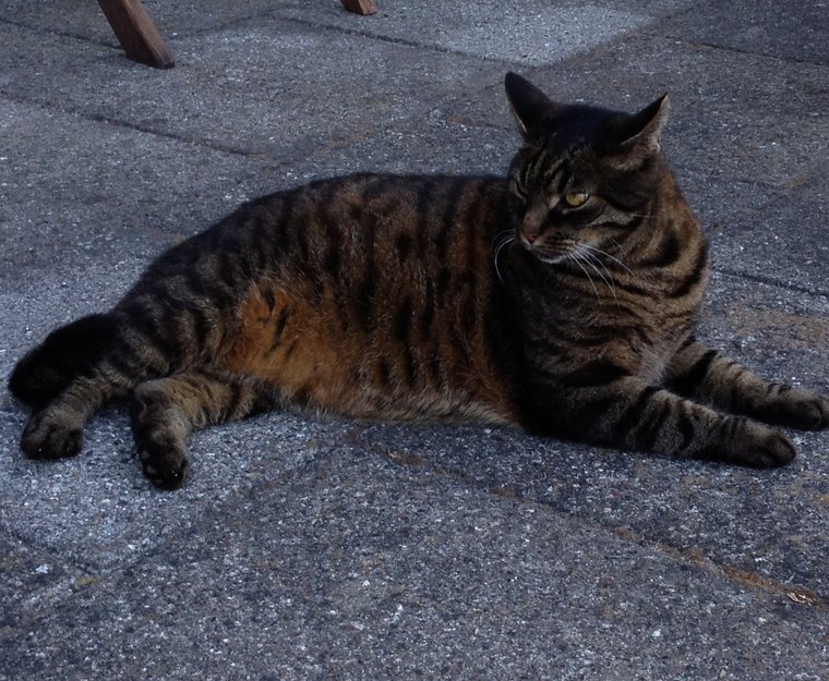 Han er en stor rolig katt ca.12 kg. Flott tigerstribet pels i brune farger. Spesiell miav lyd. Ikke redd for fremmede og tillitsfull. Han er registrert i Danmark og har dansk chip.
