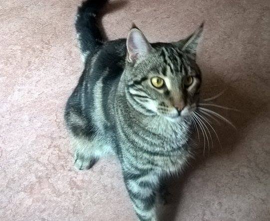 Han er stripete, og han har "gaupeører", noe jeg vet hører til maine coon rasen. Men han har ikke den lange pelsen til maine coon. Gulgrønne øyne, store poter.
