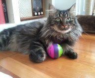 Han har på seg en rød sele. Lys brun snute og stripete ben.