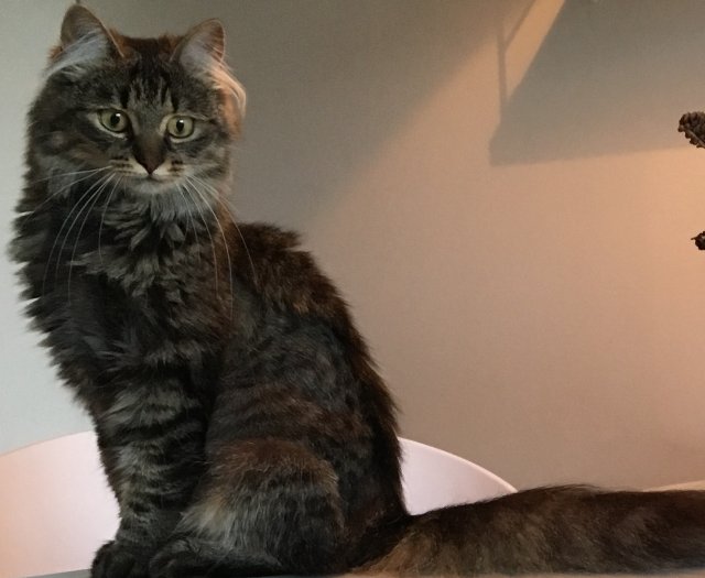 Liten guttepus på to år med bustete stor hale og hvite tuster som stikker ut av ørene. Ble barbert enkelte steder for to mnd siden, så pelsen er ikke lang overalt. Sosial og kjælen.