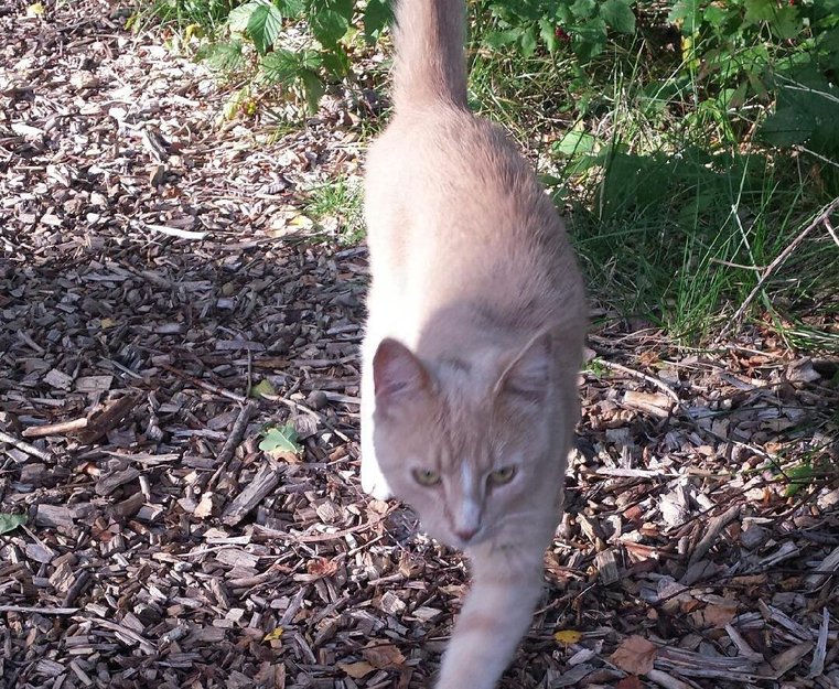 Ung kastrert hannkatt, ser ut til å være 1-2 år gammel. Blek oransje/aprikosfarget. Ingen hakk i ørene. Høy, slank/tynn.