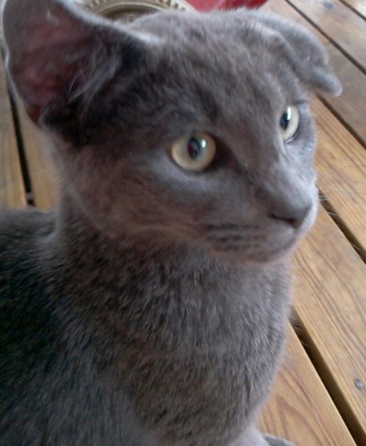 Liten, ung ukastrert grå hannkatt. Det ene øret henger ned.