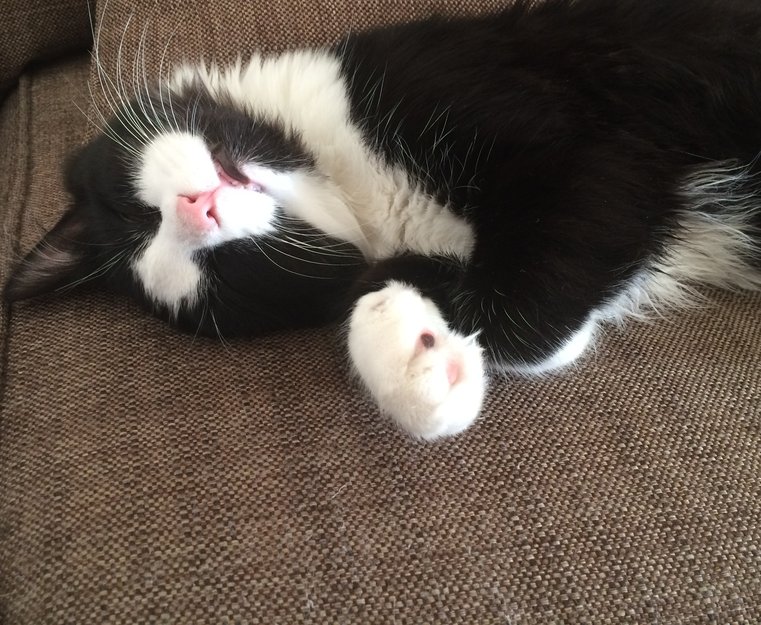 Langhåret huskatt. Sort og hvit. Veldig tilittsfull og kosete.