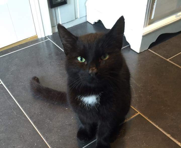 Ung hukatt funnet. Mellom 1-2 år, svart med hvit flekk på brystet. Veldig tynn, bærer preg av å ha gått ute en stund. Ikke øremerket eller chippet.