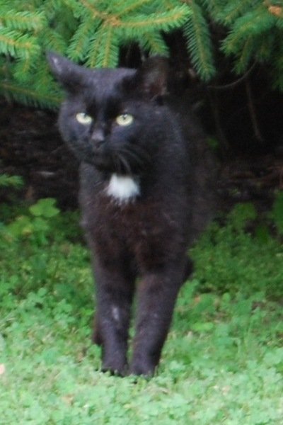 Sort katt med hvitt under haken. Hakk i begge ører etter slåsskamper.