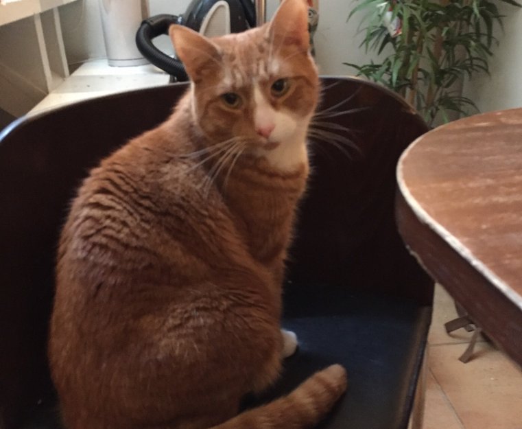 Stor, kasterte hannkatt på ca 5-6 kg. Orange på oversiden og hvit under magen. Har også noe hvitt i ansiktet, som strekker seg opp over den ene siden på nesen. Orange flekk midt på haka .