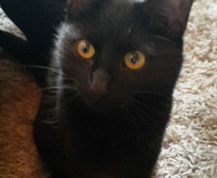 Hun er sort, gule øyne. Har et bittelite arr på høyre øret etter en flått i våres. Ellers er hun lita (selv om hun er 1år gammel). Veldig tillitsfull, hun lyder navnet Mjaumjau.